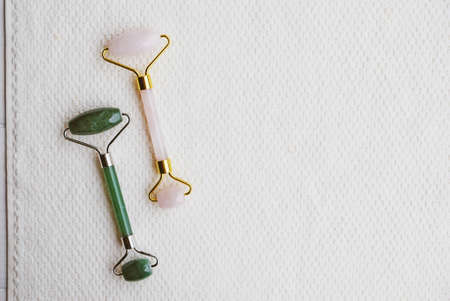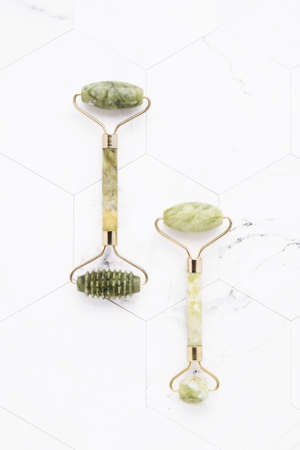 Jade face rollers for beauty facial massage therapy. Flat lay on white marble background