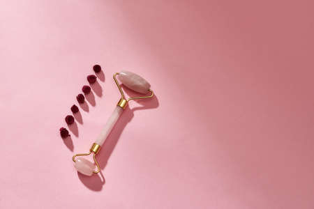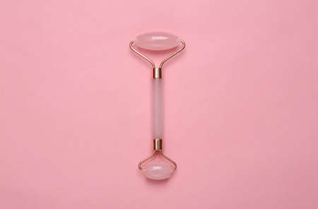 Rose quartz facial massage roller and dried rose buds isolated over pink background