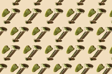 Repeating pattern with jade Gua sha scraper and facial massager on beige background.