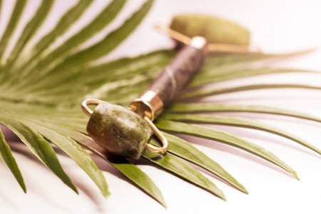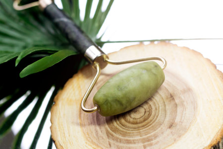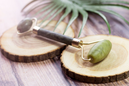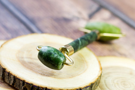 Face roller and gua sha massager made from natural jade stone. Alternative skin care