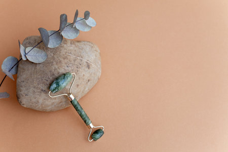 Green jade roller for facial massage on a brown stone with a dry branch on eucalyptus of a beige background. Natural anti-aging massage products for lymphatic drainage and wrinkle smoothing. Flat lay