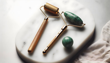 Two green jade facial rollers with gold accents are displayed on a white marble background, showcasing natural beauty and skincare tools.