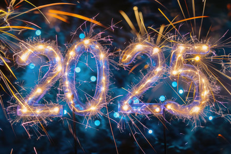 New Year 2025 sparkler writing. New Year celebration with sparkles signifying the arrival of 2025