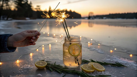 Woman's hands holding sparklers with lemon and rosemary on frozen lake.