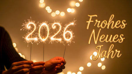 A sparkler burns brightly, forming the numbers 2026 against a bokeh background of festive lights.