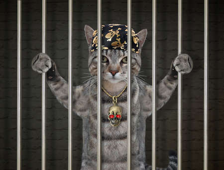 A gray cat in a bandana was arrested. He is behind bars in the prison.