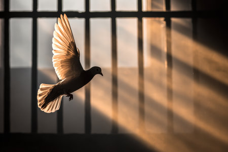 Close up view of prison bars with sunlight streaming through, creating dramatic contrast between light and shadow. scene evokes feelings of confinement and hope