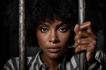 An intense and beautiful African American woman with a large afro stars confidently at the camera from behind old, weathered prison bars.