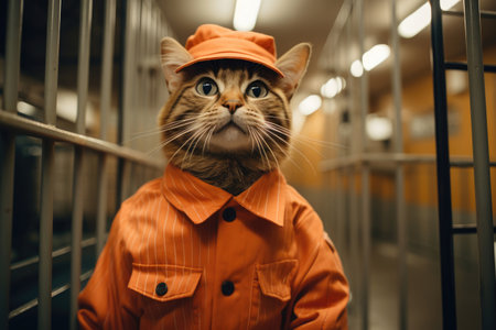 Bad cat crime wearing orange jumpsuit in a prison cell prisoner