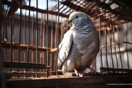 Captured in a confined space, a feathered dove peers through the rusty bars of its cage, its melancholic gaze hinting at a longing for freedom and wide-open spaces in its life.