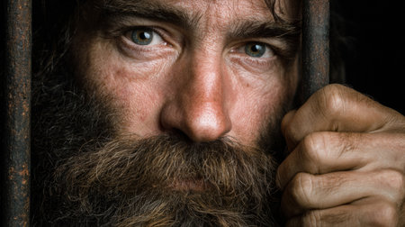 close-up of a prisoner behind bars in jail.