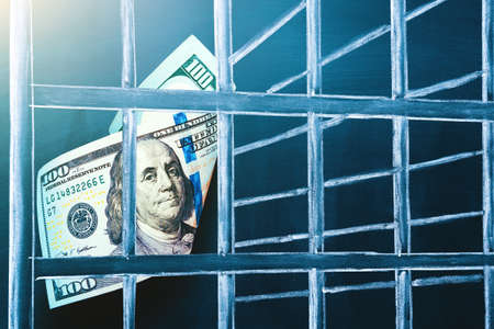 100 US dollar bill in prison. Investment trap, boycott currency concept. The concept of penalty for money laundering, theft, crime and the penalty for tax evasion. Corruption and counterfeiting