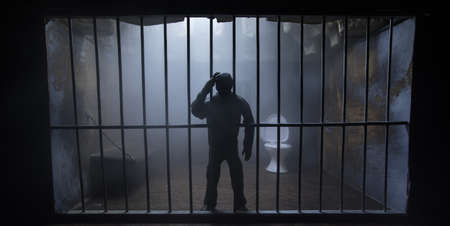 Prisoner beyond the bars of the prison cell, restriction of freedom
