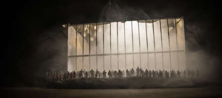People and police government power concept. Crowd looking on prison miniature. Creative artwork decoration. Selective focus.