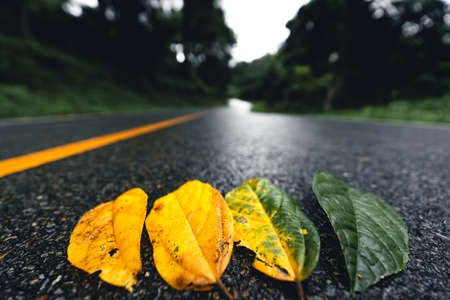 Beautiful foggy road through the forest at daytime, asphalt road on the mountain with foggy in rainy season