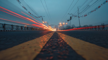 Captivating night scene showcasing a busy urban road with vibrant light trails from vehicles, emphasizing motion and the atmospheric beauty of a city in twilight.