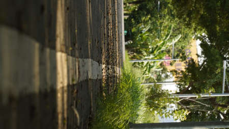 Top view of empty road texture with straight lines in white line on road. There are beautiful trees and stone pile on the side of the road, Light that shines through the tree makes sense of loneliness. Selective focus.