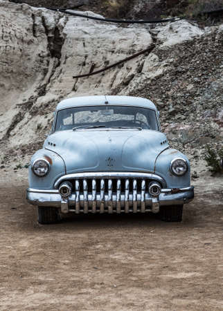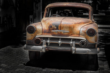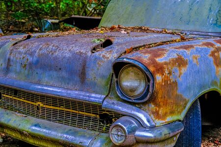 Front of a parking antique car with chrome bumper and grill, rusty fenders and hood and broken head lamps