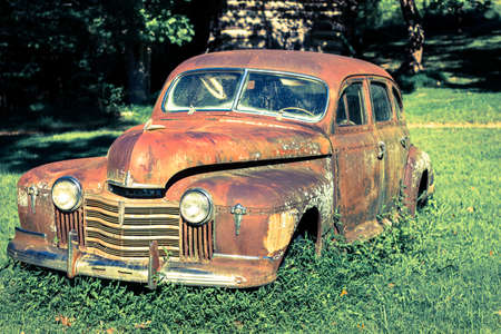 Rusty old car among the green bushes in summer. Car industry 40s.