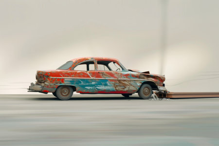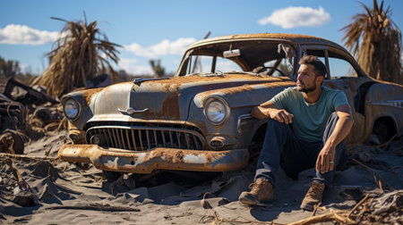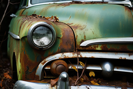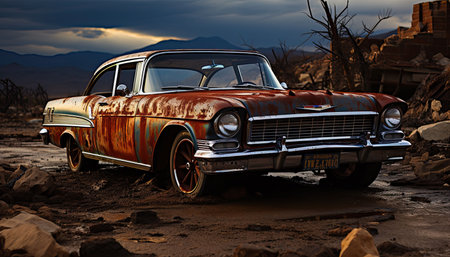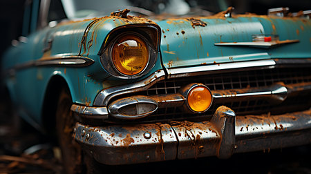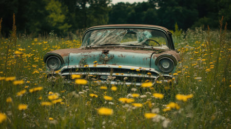 Abandoned vintage car rusts in rural meadow generated by artificial intelligence.Generate Ai