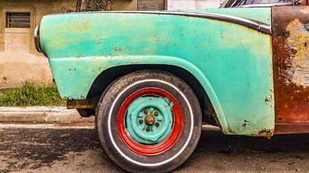 Close-up wheel and panel of old vintage rusty abandoned car, toned