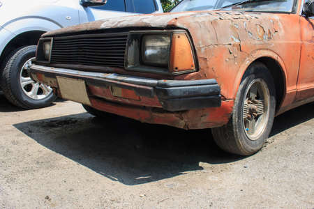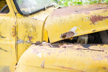 Fragment of an old passenger car on a suburban road. An old rusty car. selective focus.