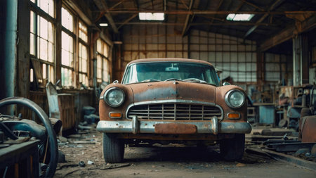 An old retro car in striking blue and pink hues sits prominently in a workshop, showing signs of wear and awaiting restoration. Surrounding tools and equipment hint at ongoing work.
