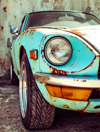 Close up view of old dark blue rusty car vehicles with headlight foreground