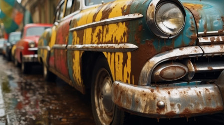 Closeup of an old, red car with a textured rusty surface, showcasing a nostalgic vibe