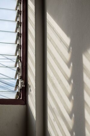 Close-up view of the black shadow from the sun shining through the shutters to the old white concrete wall in the corner of the building in the early morning.