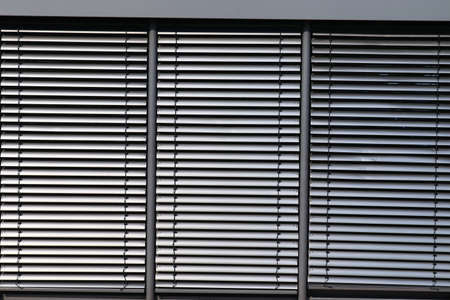 Metal blinds along the road. Background from slats. Steel window with slots.