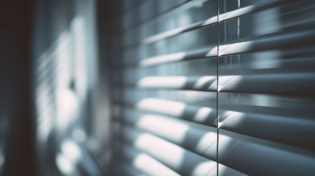 Close-up of horizontal blinds with soft light filtering through, creating a calming atmosphere in an indoor setting.