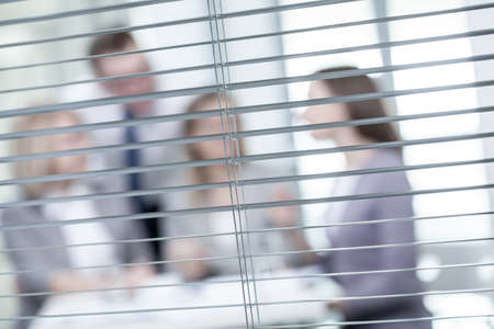Business people having meeting, view through blinds