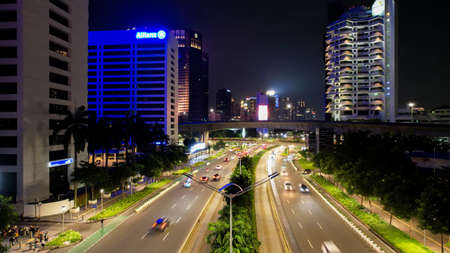 Top down view of road traffic in the heart of Jakarta business district along the Sudirman avenue in Indonesia capital city in Southeast Asia