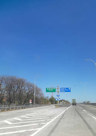 A long and straight highway in Jakarta Indonesia as seen from above the bridge, on the right side there are shady trees that grow well.