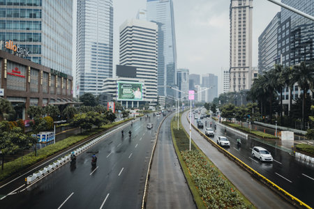 Jakarta, Indonesia: September 2022 - Jakarta street view from the pedestrian bridge after the rain with a view of the buildings