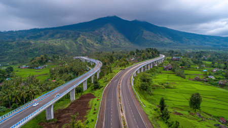 An overhead perspective reveals a highway bridge curving over vibrant green fields, contrasted by a mountain under a cloudy sky. The photograph captures the curving road's geometry and the natural environment's textures. Suitable for illustrating transportation, infrastructure, or environmental themes in various commercial and editorial contexts.