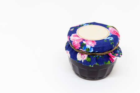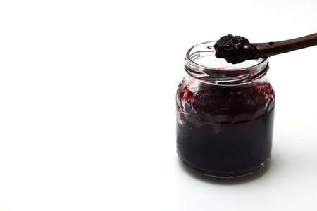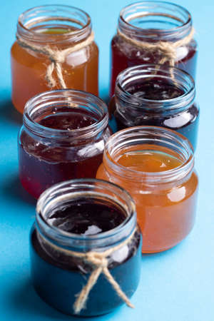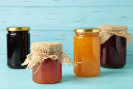 Set of colorful glass jars with iron lids and jam of different flavor, orange, red, black color on marble surface and white background. High quality photo