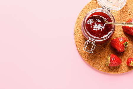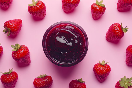 Top view of a glass jar filled with glossy strawberry jam, surrounded by fresh ripe strawberries on a pastel pink background. A sweet and vibrant food composition.