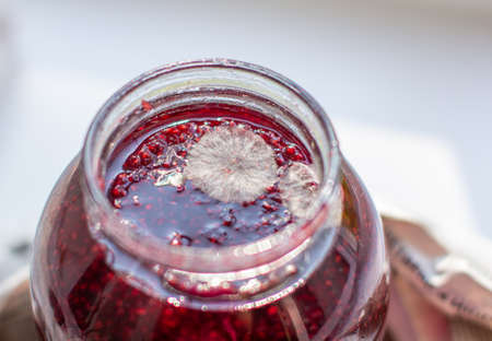 Mold in a jar of raspberry jam. Hazardous to health. Mold. High quality photo