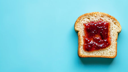 Delicious bread toast with jam, aesthetic pastel light blue background. Copy space, top view. Generative AI.