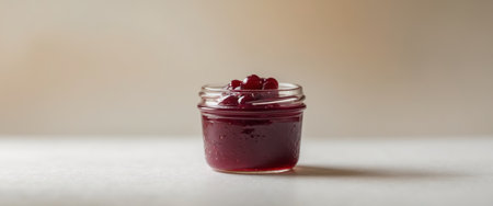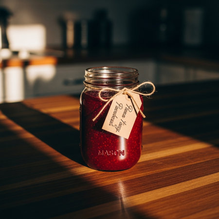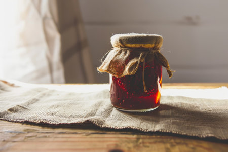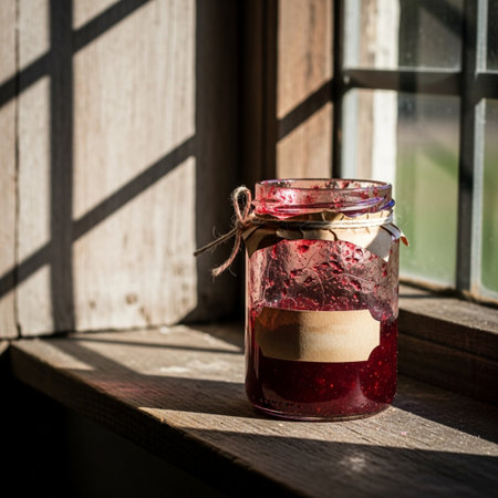 Artisanal cherry jam jar on a rustic sunlit windowsill, showing dust and cinematic shadows.