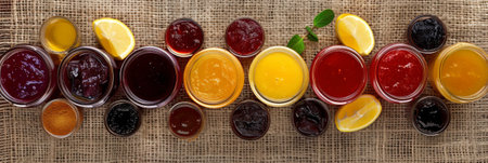 Various Homemade Jam Set, Pozzy Big Collection with Tea and Sliced Lemon on Rustic Burlap, Cornus Mas Confiture, Apricot Jelly, Grape, Plum and Apple Marmalade, Generative AI Illustration