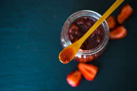 Vintage jar with fresh strawberry jam on black stone background with copy space