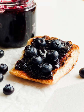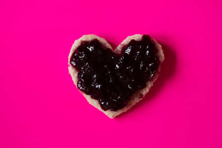 Heart-shaped slice of bread, spread with natural blueberry jam, for a romantic breakfast on Valentine's Day.