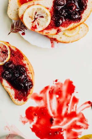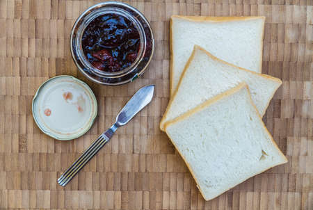 Sandwich bread, Cherry jam and Jam knife on wooden table. Top view.
