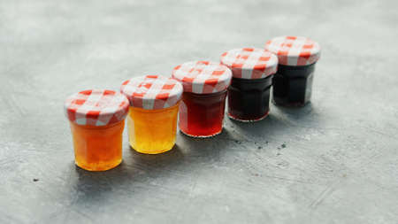 Row of small glass containers filled with assorted sweet jam and composed on gray surface
