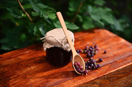 A wooden spoon with gooseberries on rustic bench, and a jar of homemade berry jam against a blueberry bush in the rural organic farm. Canning concept. Healthy organic food on the nature. Still life.