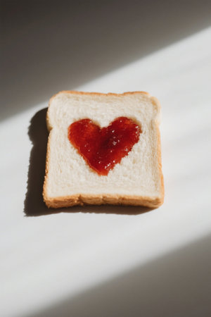 Bread with jam in shape of heart on white plate, Homemade bread for breakfast in the morning.