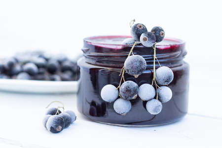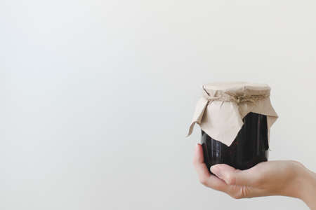 Canning, preserved food concept for winter season. Focus on a jar of blueberry jam with fresh berries on the craft lid, in the hands of a woman confectioner wearing a chef apron. Close-up.